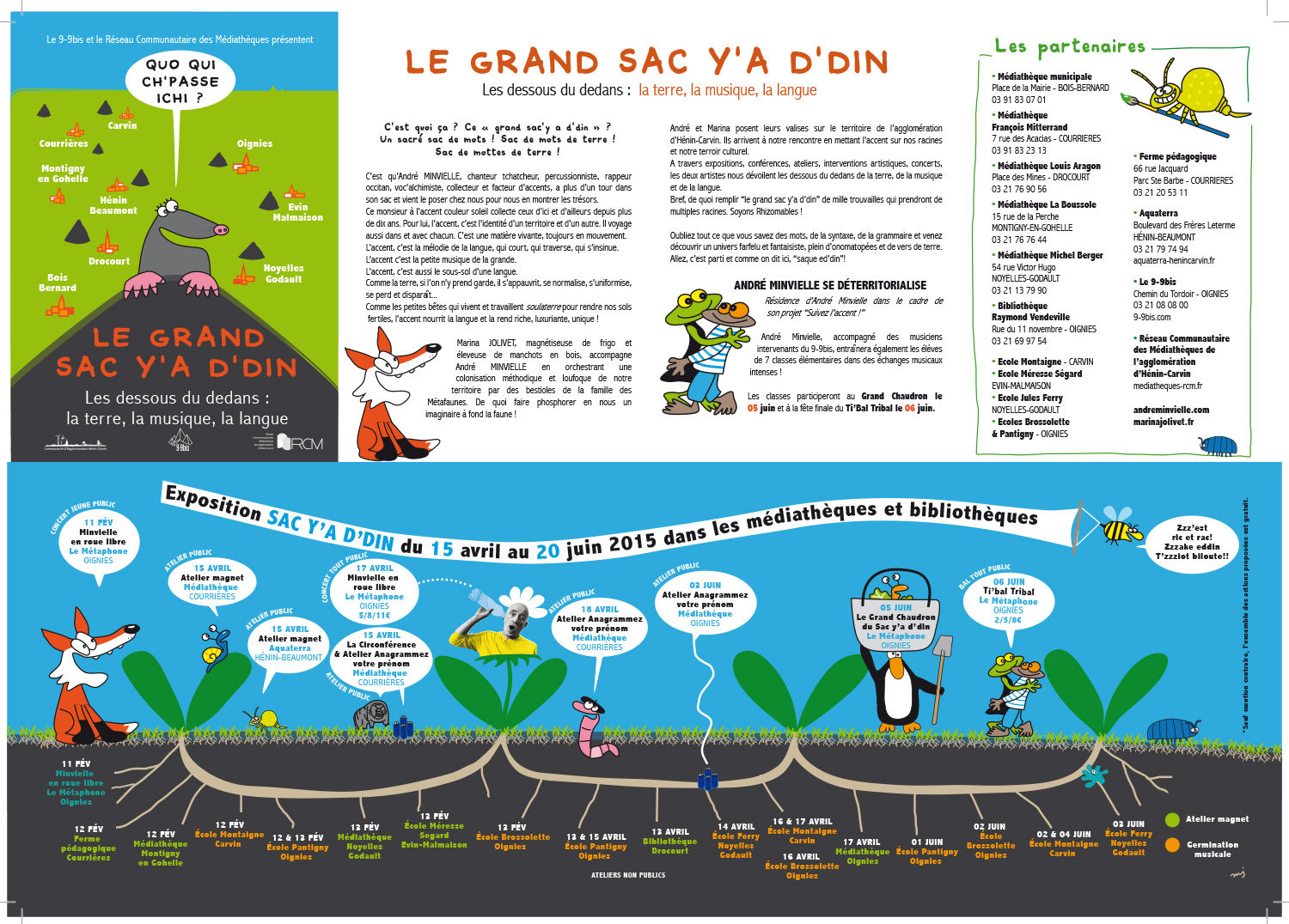 Un grand merci à Emilie Thiriez qui a épaulé Marina et à toute l’équipe des intervenants en milieu scolaire : Alexandre Noclain, Maryline Pruvost, Elodie Christelle, Estelle Deleau, Antoine Maréchal qui ont tous et chacun relayés le travail d’André Minvielle. Nous avons travaillé avec les écoles Montaigne, Berlinguez, Joliot Curie, Jules Ferry, Pierre Brossolette, Pantigny, Bois Bernars, Mersesse Ségard, à Carvin, Noyelles, Oignies, Evin Malmaison aux médiathèques de Courrières, Montigny et Noyelles, à la ferme pédagogique de Courrières, à la bibliothèque de Drocourt, à l’Aquatera d’Hénin Beaumont ...