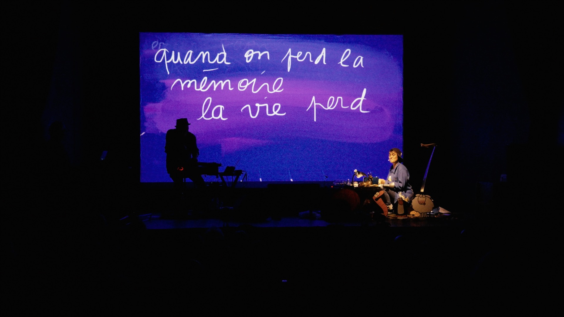 La séance de cinéma-vivant est un dialogue entre l’écran et le plateau, adressée aux spectateurs et qui témoigne d’un désir collectif de curiosité pour un monde sensible et poétique où il reste encore des âmes en quête d’émerveillement. Mais aussi une joyeuse réflexion sur l’image dans les temps modernes de l’Intelligence Artificielle. Dans une nécessaire “reprise en main”. sur la machine, on revient peu à peu au geste essentiel, celui des premiers Sapiens, celui de l’enfance de l’art.